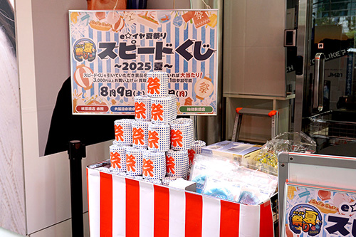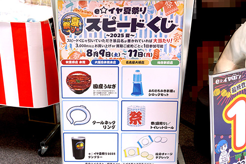 eイヤホン秋葉原店 本館の店頭では、3,000円以上の買い物をするか3,000円以上の物を買い取りに出すと参加可能な「e☆イヤ夏祭りスピードくじ~2025夏~」が行われていました。