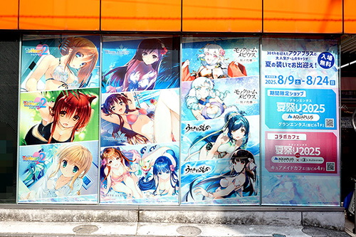オノデン1階のグランエンタスでは、「グランエンタス夏祭り2025 with アクアプラス」が開催されていました。4階のキュアメイドカフェではコラボカフェも開催中、開催期間は8月24日(日)まで。