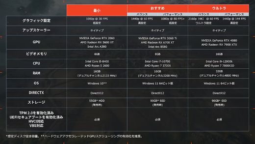 最小要件(フルHD/30FPS)では、「GeForce RTX 2060」や「Radeon RX 5600 XT」など2019~2020発売のGPUも対象となっているが、4Kウルトラ設定では「GeForce RTX 4080」や「Radeon RX 7900 XTX」などハイエンドGPUが必要とされている。標準的な動作環境の「おすすめ」は「GeForce RTX 3060 Ti」や「Radeon RX 6700 XT」「Intel Arc B580」が必要。