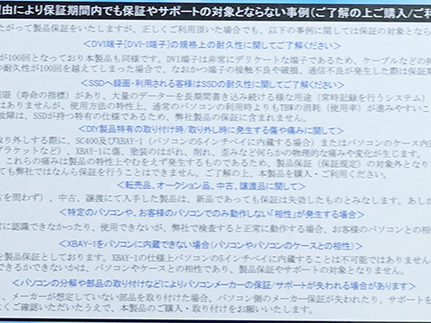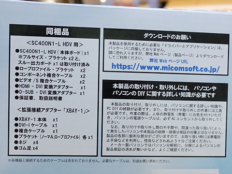 また、拡張接続アダプター「XBAY-1」が付属し、各入力端子をPC前面に引き出すことができる。ディスプレイを接続して表示できるスルー出力ボードも付属する。