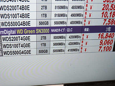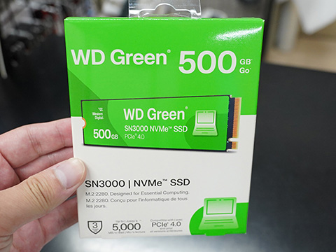 SandiskのPCIe Gen 4.0 SSD「WD Green SN3000」の500GBモデル(WDS500G4G0E)が秋葉原の一部ショップに入荷している。
