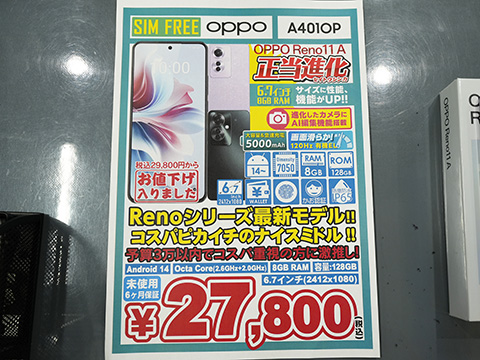 オッポジャパンの5Gスマホ「OPPO Reno11 A(A401OP)」の未使用品が、イオシス各店でセール中。