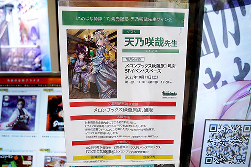 メロンブックス秋葉原1号店の5階では、「ノーゲーム・ノーライフ」の榎宮祐先生(11月29日(土)開催)や、「このはな綺譚」の天乃咲哉先生(10月11日(土)開催)によるサイン会が実施予定。なお、参加には対象商品を購入・予約し、事前の抽選に当選する必要があります。