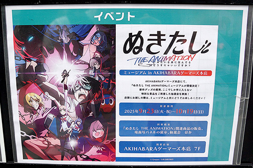 AKIHABARAゲーマーズ本店の7階では、「ぬきたし THE ANIMATION」ミュージアムが開催されていました。関連商品の販売のほか、場面写パネルの展示や抽選会などを実施。期間は10月19日(日)まで。