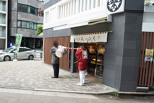 取材中、神田志乃多寿司の前を通った際にふれ太鼓に出くわしました。大相撲九月場所の開幕を告げるためのもので、江戸時代からの伝統的な行事となっています。