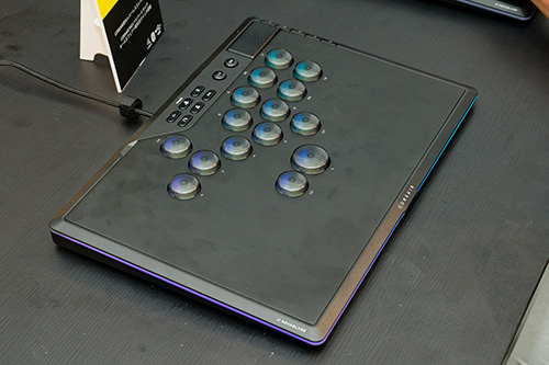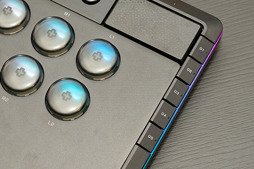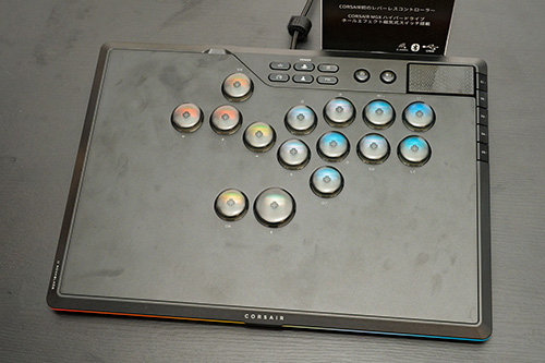 今回登場したモデルの中で一番の注目は、CORSAIR初となるレバーレスコントローラー「NOVABLADE PRO」(11月28日(金)発売予定/予価32,980円)。STREET FIGHTER 6のような対戦格闘ゲームに適した、いわゆるアケコンだ。レバーを排した代わりにメカニカルキースイッチを採用したボタンが計15個配置され、さらに右側面にはカスタマイズ可能なマクロキーである「Gキー」を5個備えている。