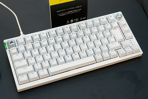 K65 Plus Wireless Mechanical Gaming Keyboard for Macは、押下圧45g、アクチュエーションポイント2.0mmの「CORSAIR MLX Red v2リニアスイッチ」を採用した75%メカニカルキーボード。8,000万回のキーストロークに耐える。有線(USB)、2.4GHzワイヤレス、Bluetoothの3Way接続に対応し、MacのほかにiPad、Xbox、PS4、PS5でも使用可能。メディアコントロールなどに使えるロータリーダイヤルも備える。バッテリー駆動時間は266時間(ライティングオフ時)。
