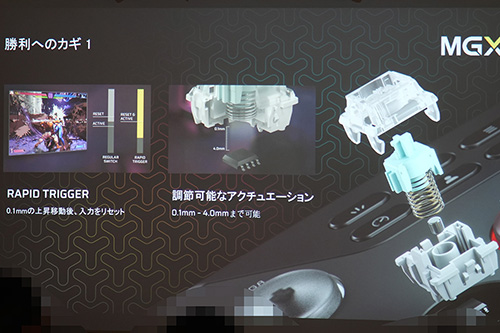 15個のボタン(うち3個はGキー)は、高精度で1億5,000万回のキーストロークに耐える「CORSAIR MGX ハイパードライブ ホールエフェクト磁気式スイッチ」を使用。アクチュエーションポイントは0.1~4.0mmの幅広い調整幅を持ち、ラピッドトリガーにも対応。ライバル製品と比較して半分以下の遅延(PC環境で最小3.028ミリ秒)に抑えているという。また、SOCD(反対方向同時入力)に対応し、モード切り替えによりボタン入力の優先度を変えることも可能だ。