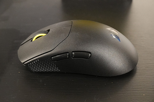 「SABRE v2 PRO」(実売15,980円前後)は、わずか36gという軽量な5ボタンワイヤレスマウス。専用ドングルによる2.4GHzワイヤレス接続に対応し、ポーリングレートは1,000/2,000/4,000/8,000Hzの4段階で設定可能。10~33,000DPIの範囲で、50DPI刻みの調節が可能な「CORSAIR MARKSMAN S」センサーを搭載する。
