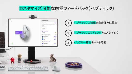 マウス本体のステータスや、同社ユーティリティ「Logi Options+」との連携操作時に振動モーターを介した触覚フィードバックを提供するほか、Adobe Photoshopなど、対応アプリと連動したフィードバックも実装される。