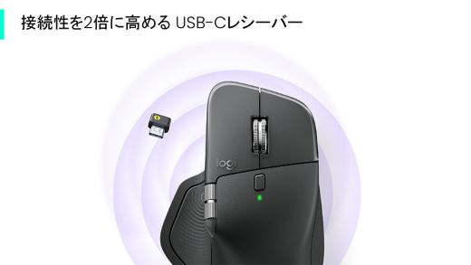 付属のLogi BoltドングルはUSB-C接続となり、小型化しつつも接続強度は2倍に改善されたとする(MX MASTER 4とのペアリング時)。