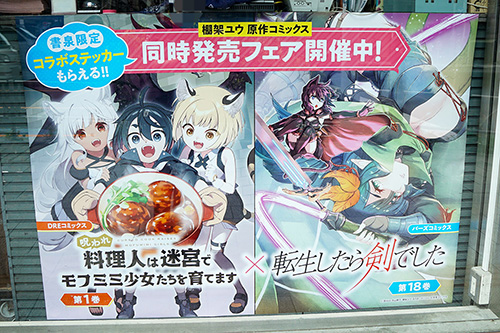 書泉ブックタワーでは、「棚架ユウ 原作コミックス 同時販売フェア」が開催されていました。小説家の棚架ユウ先生原作コミックス「呪われ料理人は迷宮でモフミミ少女たちを育てます」および「転生したら剣でした」の発売記念イベントで、対象商品2点を購入するとステッカーがもらえるほか、抽選特典にも応募可能。開催期間は10月23日(木)まで。