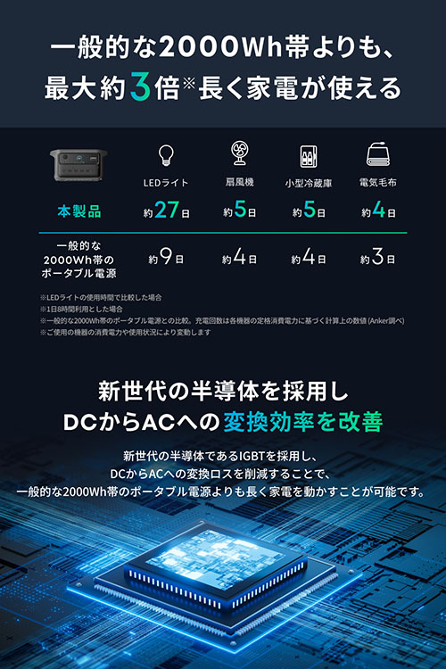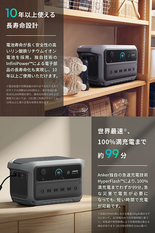 世界最速の本体充電ともうたっている。Anker独自の急速充電技術「HyperFlash」により世界最速の約99分で満充電できるという。急な災害でも慌てずに本体を充電できるとしている。