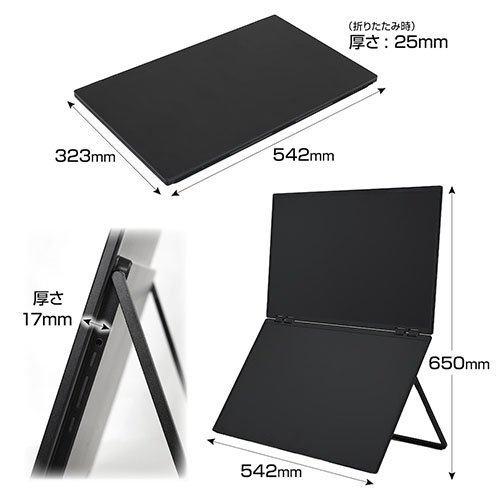 サイズは542×17×650mm(折りたたみ時:542×25×323mm)、重量は約5kg。VESA規格(100×100mm)に対応する。