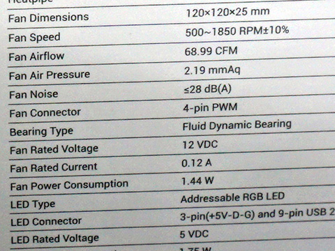 上記以外の主な仕様は共通で、冷却ファンにはPWM制御に対応する120mm静音FDBファン「FK120」が採用されている。回転数は500~1,850RPM(±10%)、風量は68.99CFM、静圧は2.19mmAq、騒音値は28dB(A)。サイズは120×120×25mm。