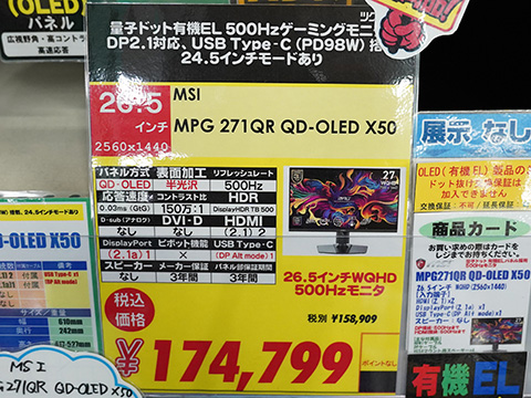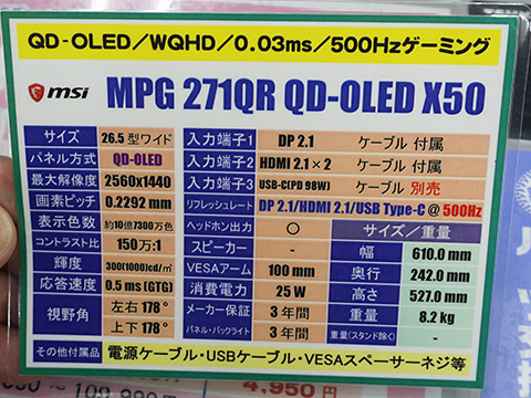 最大リフレッシュレート500Hz、応答速度0.03ms(GTG)の26.5インチQD-OLEDモニター「MPG 271QR QD-OLED X50」がMSIから発売された。