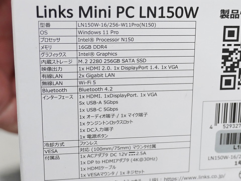 LN150WはIntel Processor N150、16GBのDDR4メモリ、256GBのM.2 SATA SSD、Windows 11 Proを搭載したファンレスPC。