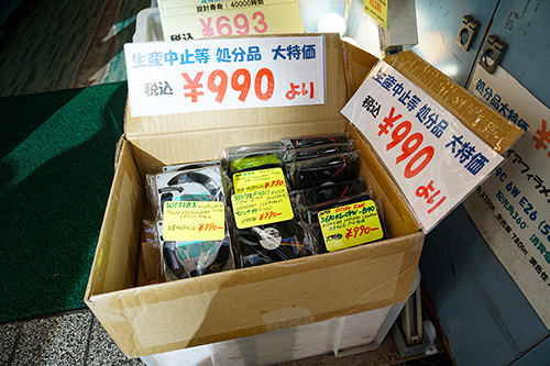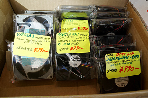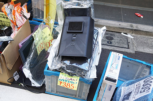 ワイケー無線では、棚卸大処分セールが行われていました。監視カメラ型のダミーカメラなど珍しい一品も。