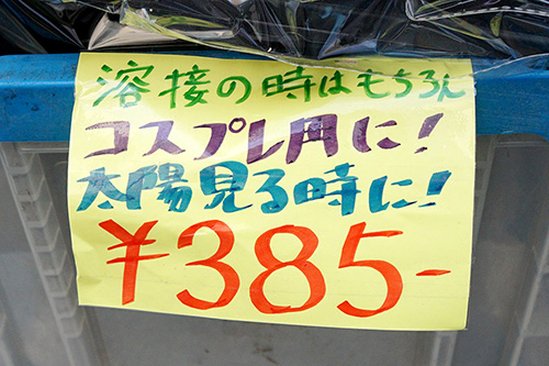 あきばお~禄號店では、プラスチック製の手持ち溶接面が385円で販売されていました。同店曰く溶接用途意外にも、コスプレ小物や太陽を見る時にも使えるとか。