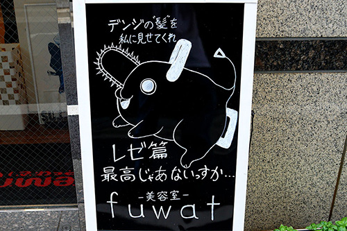 美容室fuwatや横浜くりこ庵 秋葉原店では、大ヒット上映中の劇場版「チェンソーマン レゼ篇」に関連したイラストを掲載。横浜くりこ庵 秋葉原店にホワイトボードが設置されているのは珍しいような気がします。