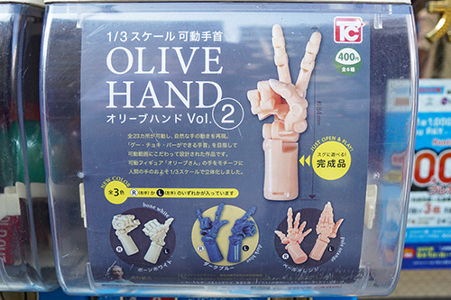 取材中に見かけたカプセルトイをご紹介。自然な手の動きが再現できる1/3スケール可動手首「オリーブハンド Vol.2」が登場。全23か所が可動する、「グー・チョキ・パーができる手首」を目指し可動範囲にこだわって設計された作品。イラストの参考用に最適なので、Vol.1登場時に秋葉原では即品切れとなっていました。