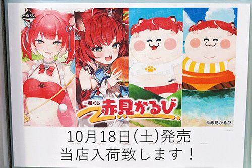 ローソン 外神田三丁目店に、10月18日(土)に発売予定の一番くじ「赤見かるび」の入荷が告知されていました。Crazy Raccoon所属のVTuber「赤見かるび」のグッズが景品となった一番くじです。
