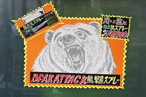 また、セールとは関係ないのですが、何かと巷で話題になっている熊対策に「強力熊スプレー」の販売をアピールするインパクトのあるPOPも掲載していました。