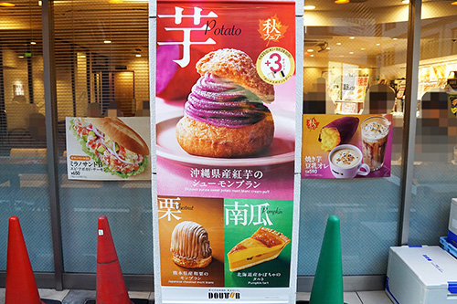 ドトールコーヒーショップ 外神田1丁目店では、秋フェアが開催されていました。期間限定で「沖縄県産紅芋のシューモンブラン」、「熊本県産和栗のモンブラン」、「北海道産かぼちゃのタルト」といった国産の秋の味覚を使用したデザートメニューが販売されています。