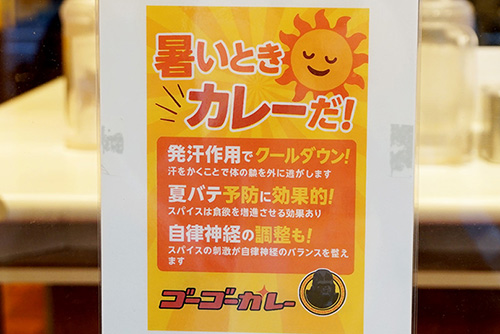 ゴーゴーカレー 秋葉原中央通店で、夏バテ予防にカレーをおすすめするPOPを掲載していました。発汗作用のほか、スパイスの刺激で自律神経を整える効果が狙えるそうでそう。