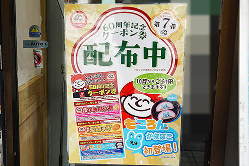 箱根そば 秋葉原店では、60周年を記念してクーポン券の配布が行われていました。かき揚げ天やコロッケといったトッピングが無料になるクーポンで、小田急電鉄の子育て応援マスコットキャラクター「もころん」の柄が入ったかまぼこも対象となっています。