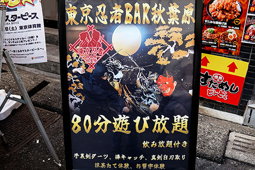 1回に横浜家系ラーメン 壱角家 秋葉原店が入居する秋葉原ダイヤモンドビルの3階に、「東京忍者BAR秋葉原」がオープンしていました。一般的なコンカフェかと思ったのですが、手裏剣ダーツや真剣白刃取り、抹茶たてや習字なども楽しめるちょっと変わったカフェバーのようです。スタッフの衣装もガチガチの忍者といった出で立ちで、海外観光客に向けて忍者人気を取り入れたcafe&BARなのかも?
