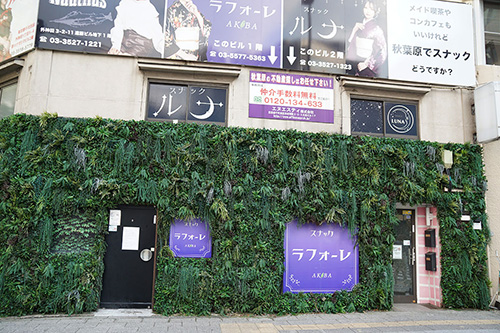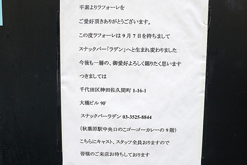 昌平橋通り沿いにあり、緑に覆われたような壁面が特徴的な「スナックラ フォーレ」が移転。移転先はゴーゴーカレー 秋葉原1号店が1階にある大橋ビルの9階で、「スナックバー ラデン」と名称を変えて営業を行っています。