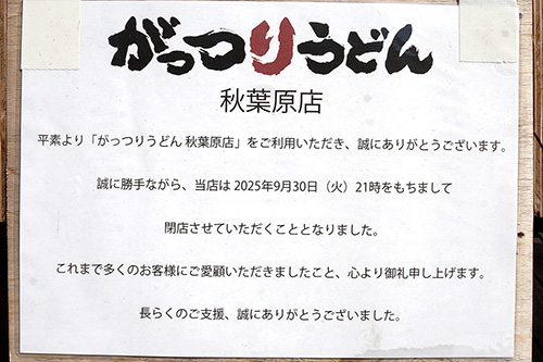昨年9月、昭和通り沿いにオープンした「がっつりうどん秋葉原店」。「9月30日(火)21時をもちまして閉店させていただくこととなりました。」と張り紙が掲載されました。