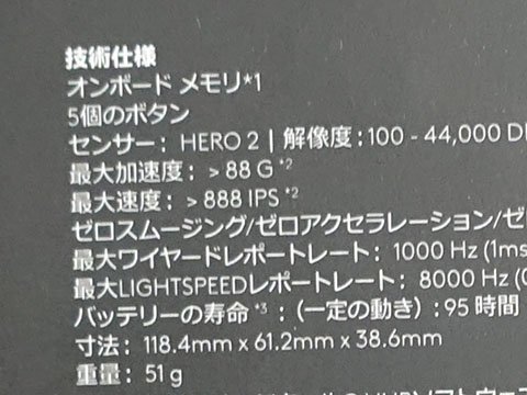HERO 2 センサーの解像度は100~44,000DPI。LIGHTSPEEDについては、遅延体感ゼロの安定したパフォーマンスと、快適なプレイ環境を実現するとしている。USBレポートレートは1,000~8,000Hz。