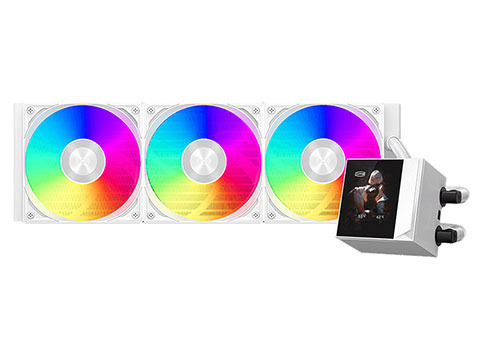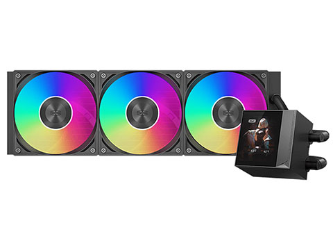これは、360mmサイズのラジエーターを備えた簡易水冷CPUクーラー。水冷ヘッド部分に2.4インチIPSディスプレイ(解像度240×320、リフレッシュレート60Hz)を搭載しており、専用の「CPSソフトウェア」を使用することで、CPU温度などのシステム情報を表示できるほか、MP4やGIF形式のアニメーション、JPGやPNG形式の画像などを表示させることができる。