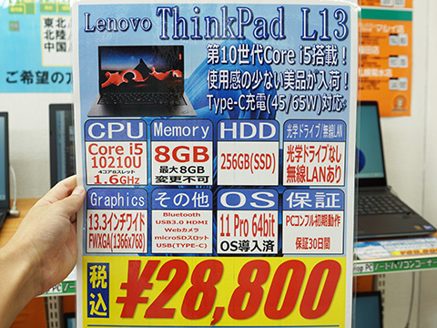 Core i5-10210U+Windows 11 Pro搭載の「ThinkPad L13」が28,800円!中古PCセール