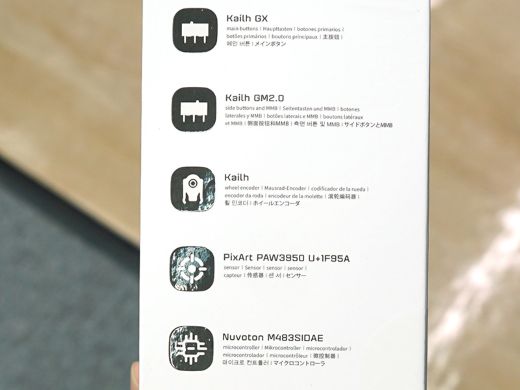 光学センサーにはカスタムセンサーの「PixArt PAW3950 U+1F95A」、MCUに「Nuvoton M483」、メインボタンスイッチにKailh GXを搭載。ホイールエンコーダーはKailh Dustproof。