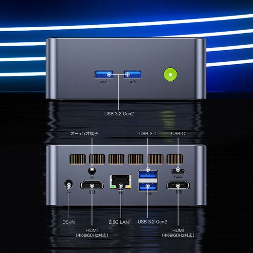 前面ポートはUSB 3.2 Gen2 Type-A×2。背面ポートはUSB 2.0×1、USB 3.2 Gen2 Type-A×1、HDMI 2.0×2、2.5G LAN×1、USB Type-C×1、3.5mmオーディオ×1。Wi-Fi 6、Bluetooth 5.2も搭載する。