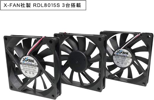 付属ファンはX-FAN製の80mm角15mm厚ファン「RDL8015S」×3で、回転数は2,000RPM、風量最大23.02CFM、静圧最大1.28mmH2O、騒音値21.6dBA。コネクタは3ピンで、ケーブル長さは300mm。