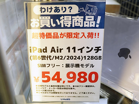 「第6世代(M2搭載)iPad Air 11インチ 128GB」が54,980円、「第10世代iPad 128GB」が33,980円など。