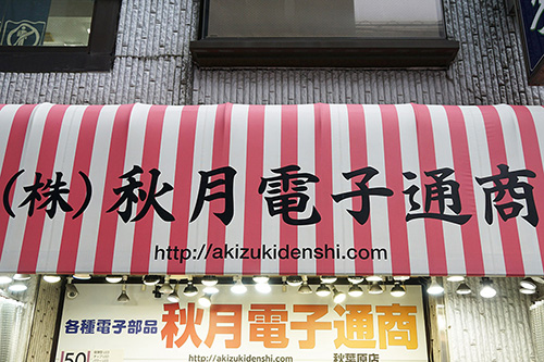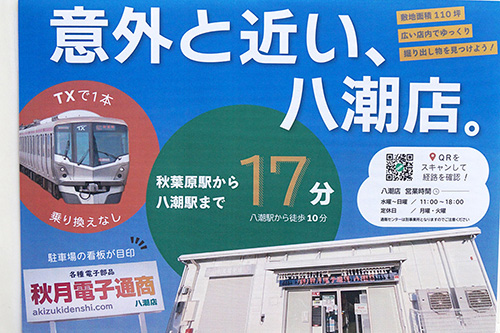 秋月電子通商 秋葉原店に、埼玉県八潮市の系列店「秋月電子通商 八潮店」をアピールするPOPが掲載されていました。秋葉原からつくばエクスプレスを使い乗り換えなしで17分、そこから徒歩10分で到着するとのことです。