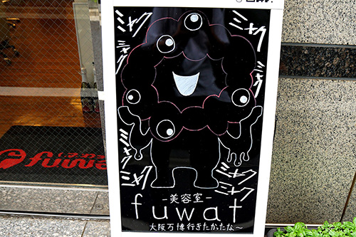 美容室fuwatの店頭黒板が更新。大阪・関西万博公式キャラクター「ミャクミャク」のイラストに「大阪万博行きたかったな~」というメッセージが掲載されていました。みなさんは大阪・関西万博に行きましたか?