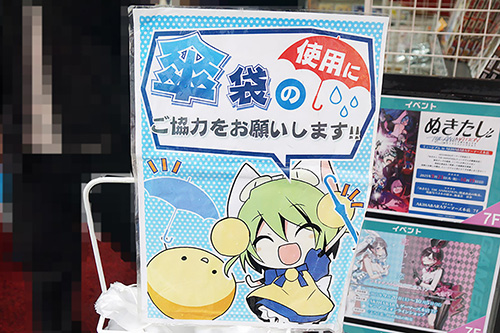 取材日の4日はあいにくの雨模様。AKIHABARAゲーマーズ本店の店頭に設置された傘袋に、利用を促すPOPが掲載されていました。