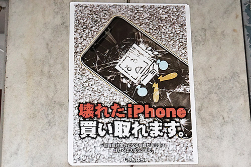 じゃんぱら秋葉原3号店の店頭には、「壊れたiPhone買い取れます。」とiPhoneの買取をアピールするPOPが掲載されていました。壊れているものとなると、部品取りや修理して販売などに使うのでしょうか?