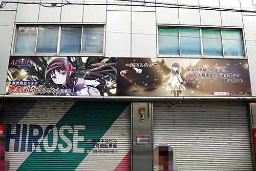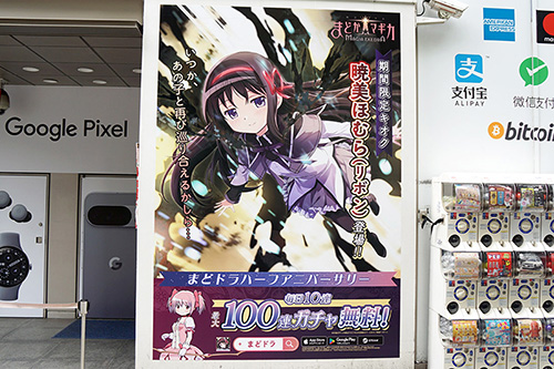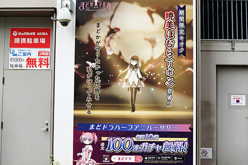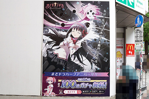 秋葉原の各所に「魔法少女まどか☆マギカ Magia Exedra」のハーフアニバーサリーを記念した広告が掲載されていました。