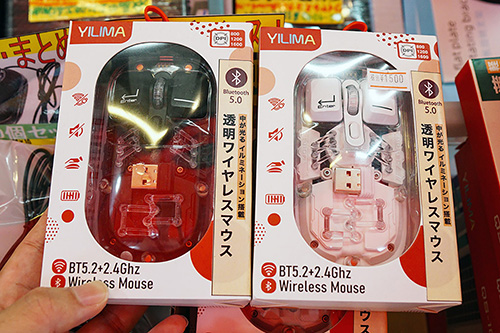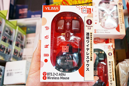 あきばお~弐號店では、ライティング機能付きの透明なワイヤレスマウスが販売されていました。Bluetooth/2.4Ghz無線の2種類のワイヤレス接続が可能で1,500円。メインボタンがかなり特徴的な見た目をしているので、ちょっと変わった見た目のマウスが欲しい人には安価で良い選択肢かもしれません。