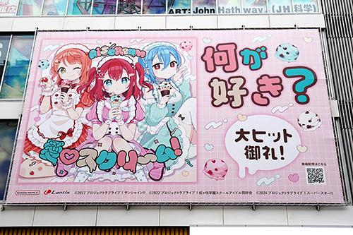 秋葉原ラジオ会館の壁面にラブライブ!シリーズの楽曲「愛スクリ~ム!/AiScReam」の広告が掲載されていました。少し前に楽曲内の「何が好き?」というコールレスポンスがショート動画などで大流行していましたね。