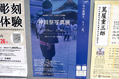 千代田区からのお知らせに、神田スクエアで開催中の神田祭写真展のポスターが記載されていました。神田錦町の対象店でスタンプを貯めると御神酒などが貰えるスタンプラリーも実施中。期間は11月16日(日)まで。