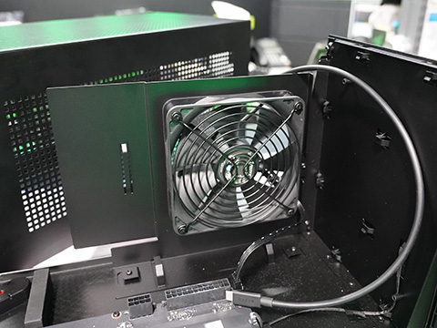 ケースには120mmファンが搭載されている。システム負荷に応じて自動で回転数が調整され、また、Razer Synapseソフトウェアでファンカーブのカスタマイズも可能とのこと。
