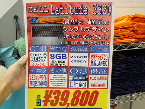 Core i5-1145G7(4コア/8スレッド)搭載の13.3インチノート「Latitude 3320」の中古品が、PCコンフル 秋葉原3号店でセール中。